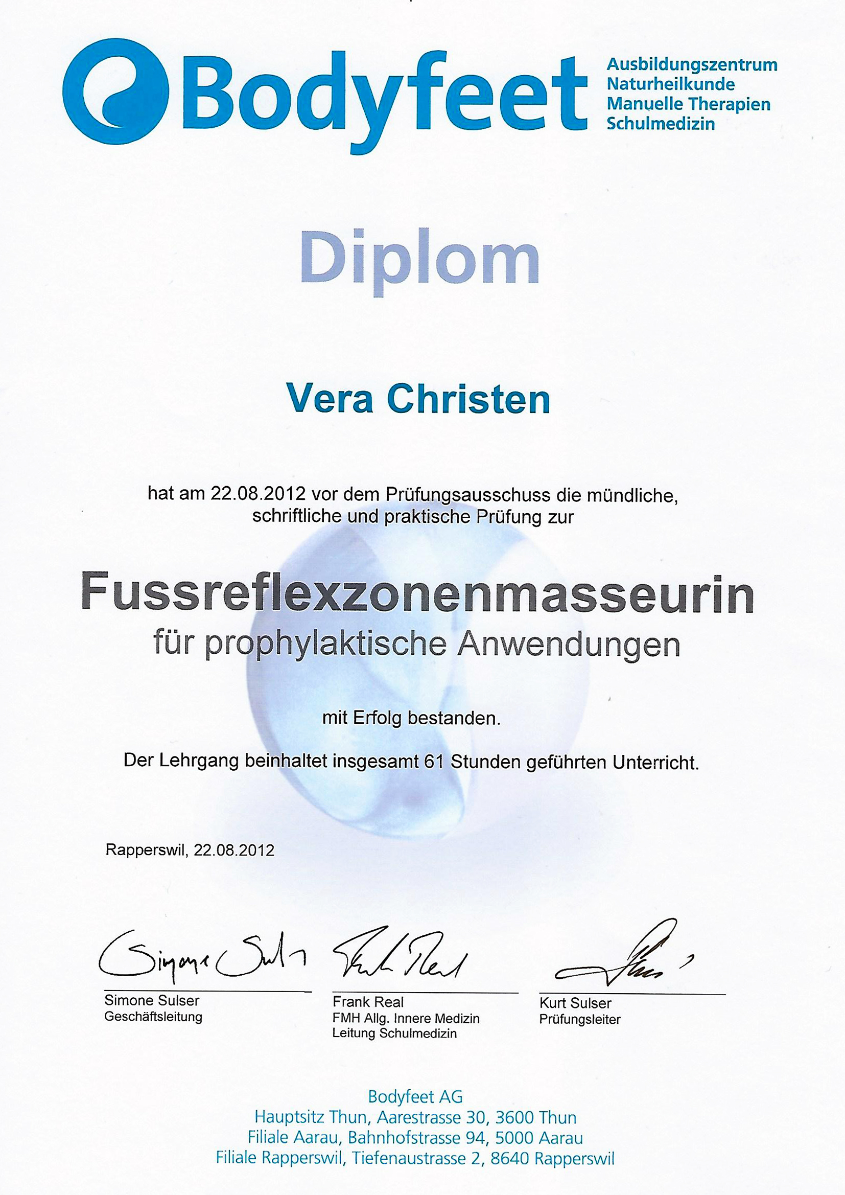 Bereits in meiner Ausbildung zur Drogistin habe ich mich mit dem menschlichen Körper und seinen Funktionen befasst. Und seither fasziniert mich dieses Wunder. In meinen Weiterbildungen zur Fussreflexmasseurin- sowie Therapeutin aber auch im Bereich Yoga beschäftigte ich mich abermals intensiv mit dem menschlichen Organismus. Es ist für mich von grosser Bedeutung, unserem Körper Sorge zu tragen.